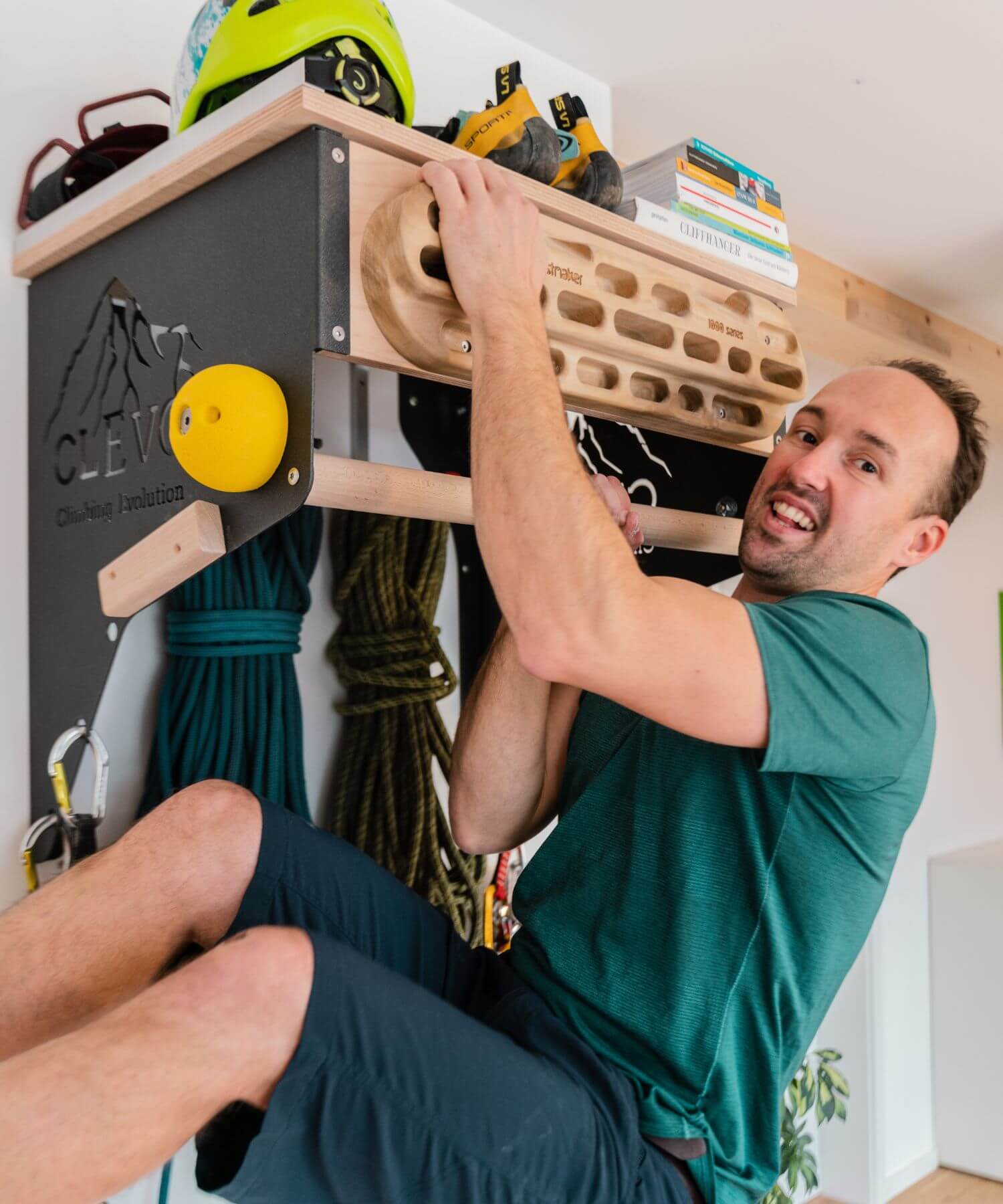 Nous sommes CLEVO Climbing. Depuis 2019, nous développons et produisons depuis l'Allgäu et Munich des modules d'escalade de haute qualité pour la musculation à domicile. Nos modules uniques au monde te permettent de monter toutes sortes de fingerboards, poignées, réglettes, boules, anneaux, etc. sur les appareils et de grimper de manière plus dynamique.